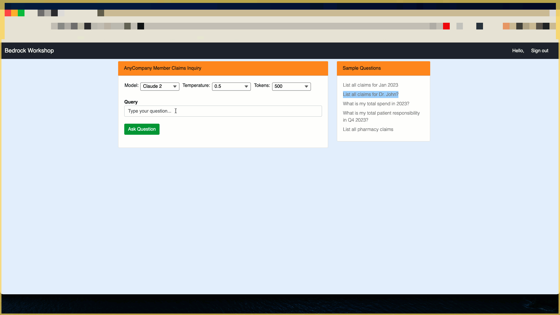 This step takes the user’s questions as input and converts that into a SQL query that can be used to retrieve the claim- or benefit-related information from a relational database. A pre-configured prompt template is used to call the LLM and generate a valid SQL query. The prompt template contains the user question, instructions, and database schema along with key data elements, such as member ID and plan ID, which are necessary to limit the query’s result set.