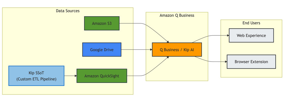 Kip AI demonstrates how we’ve comprehensively integrated AI capabilities with our existing data infrastructure. We use multiple data sources, including Amazon S3 for our storage needs, Amazon QuickSight for our business intelligence requirements, and Google Drive for team collaboration. At the heart of our system is our custom extract, transform, and load ETL pipeline (Kip SSoT), which we’ve designed to feed data into QuickSight for AI-enabled analytics. We’ve configured Amazon Q Business to seamlessly connect with these data sources, allowing our team members to access insights through both a web interface and browser extension. The following figure shows the architecture of Kip AI.