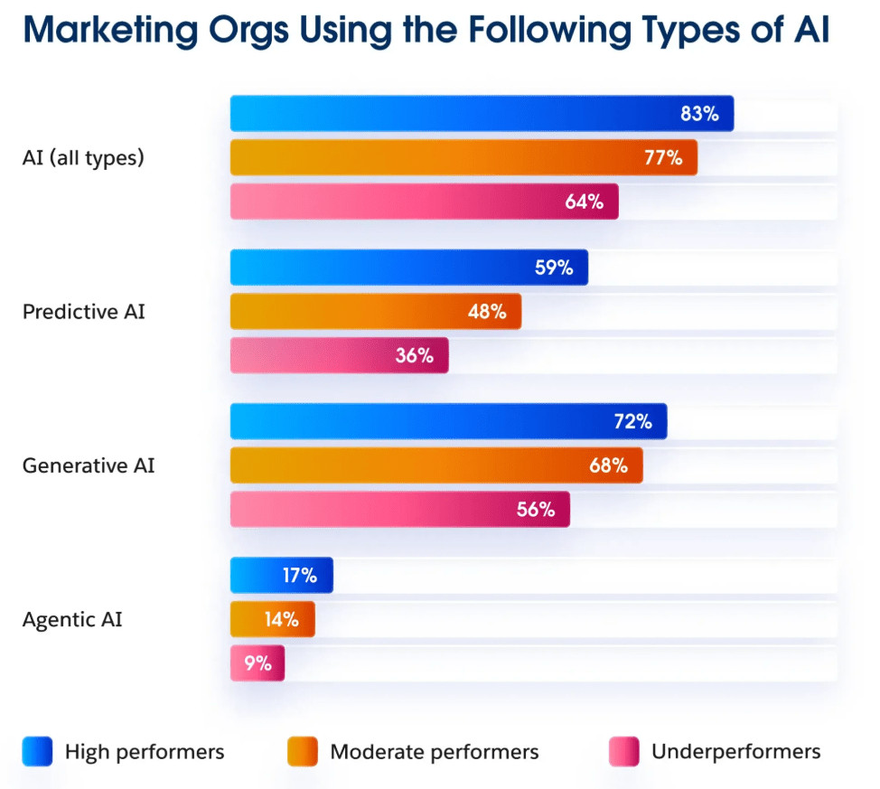Digging deeper into the data, we saw something very interesting — the highest-performing marketing teams are nearly twice as likely to be using AI agents compared to underperformers.