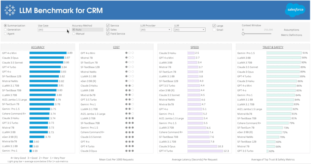 With the rise of AI agents, which are easy to implement and grounded with CRM data with Agentforce, we added an agent use case to the benchmark (select the Agent option in the top left corner of the dashboard). Keep in mind that an agent with its reasoning engine can enable any of the use cases in the benchmark (like Service Call Summary). This new, differentiated Agent benchmark uses real data, considers the necessary business metrics (accuracy, costs, speed, and trust), includes tens of thousands of evaluation points by domain experts, and is presented within the same easy-to-use Tableau dashboard as a resource for anyone to use.