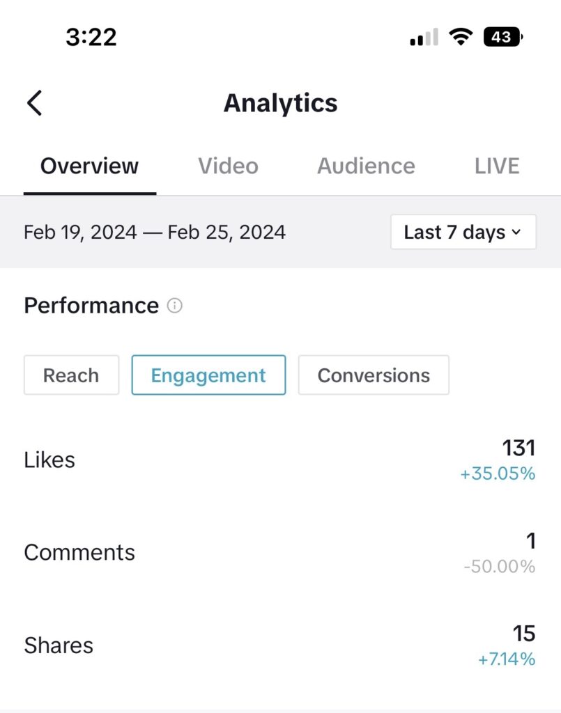 If you use TikTok’s built-in analytics, the Overview section provides you with a detailed look into your engagements over a specified time period (either 7 days, 28 days, 60 days or a custom time frame you can select):