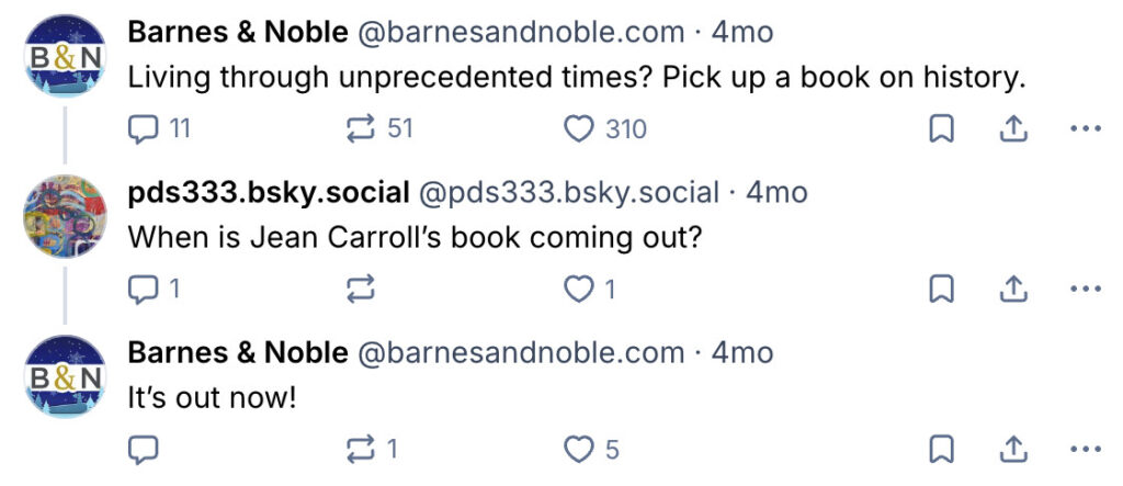 Here’s the team at Barnes & Noble connecting with a user after they publish a playful post about unprecedented times. The user responds about an upcoming book and the social media marketer lets them know it’s available now. Without any ads, Barnes & Noble responded in real time and surfaced a relevant product in a way that felt helpful rather than promotional. This interaction works because it feels responsive, timely and genuinely helpful—qualities that matter more on Bluesky than polished promotional messaging.