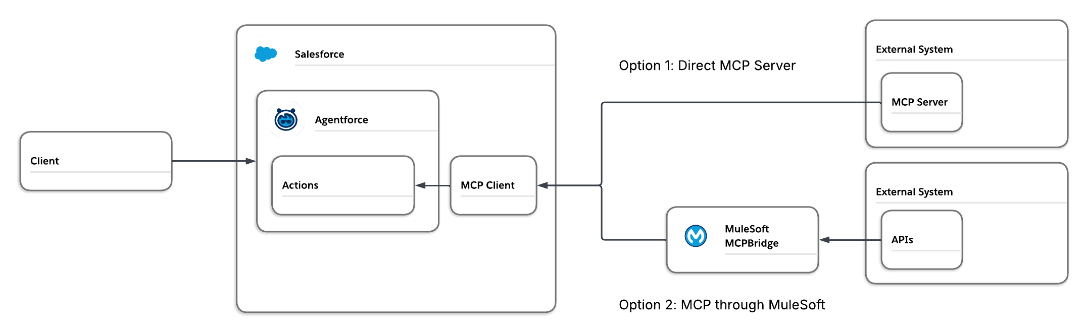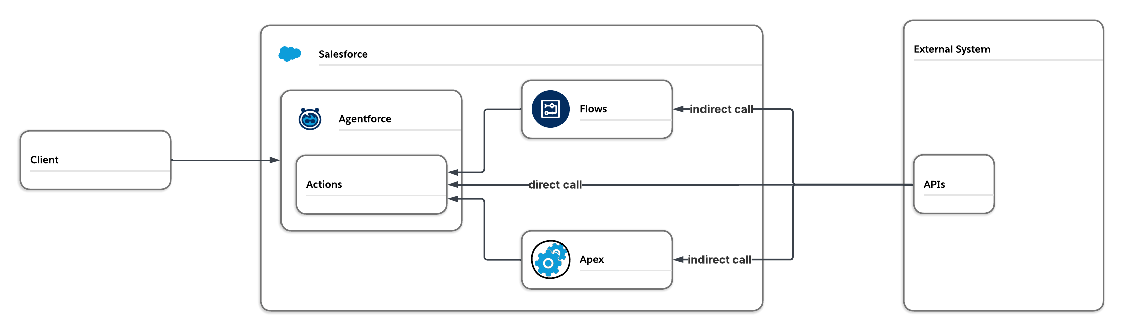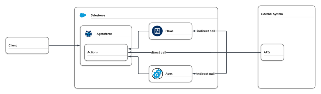 Salesforce native integration options, such as Salesforce Connect, API, and Bulk API, are not inherently agentic. To enable agentic capabilities, these integrations often require additional flows or Apex code to accurately capture inputs and process results before they can be used as actions. This approach introduces extra effort, as each distinct agent interaction requires its own configuration.