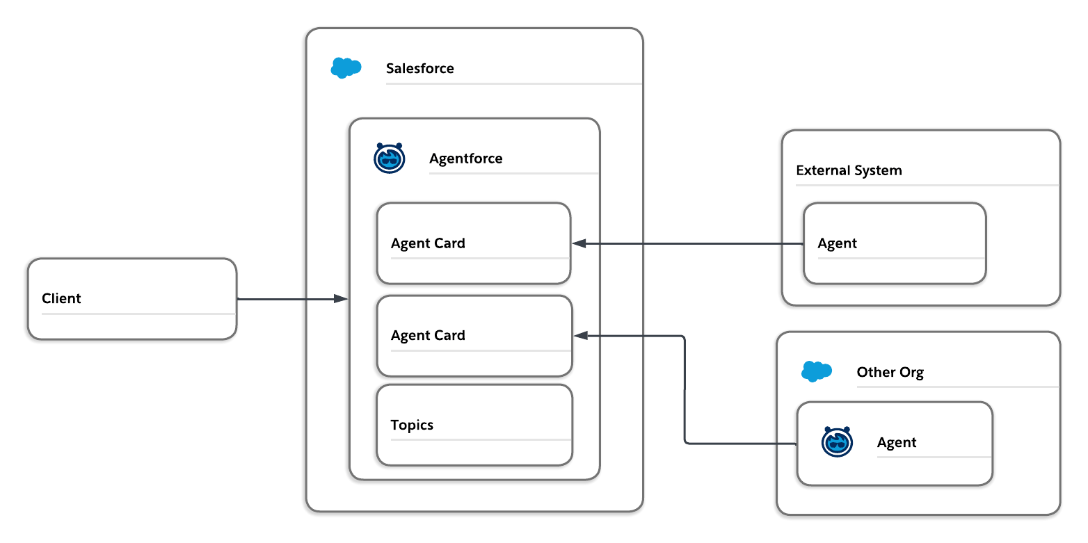 The A2A collaboration process begins with discovery via an Agent Card. This card specifies the agent’s supported communication protocols and skills. Agentforce uses this card to understand the agent’s capabilities, then establishes a secure handshake using OAuth 2.0 before initiating before establishing the connection for the main agent to use.