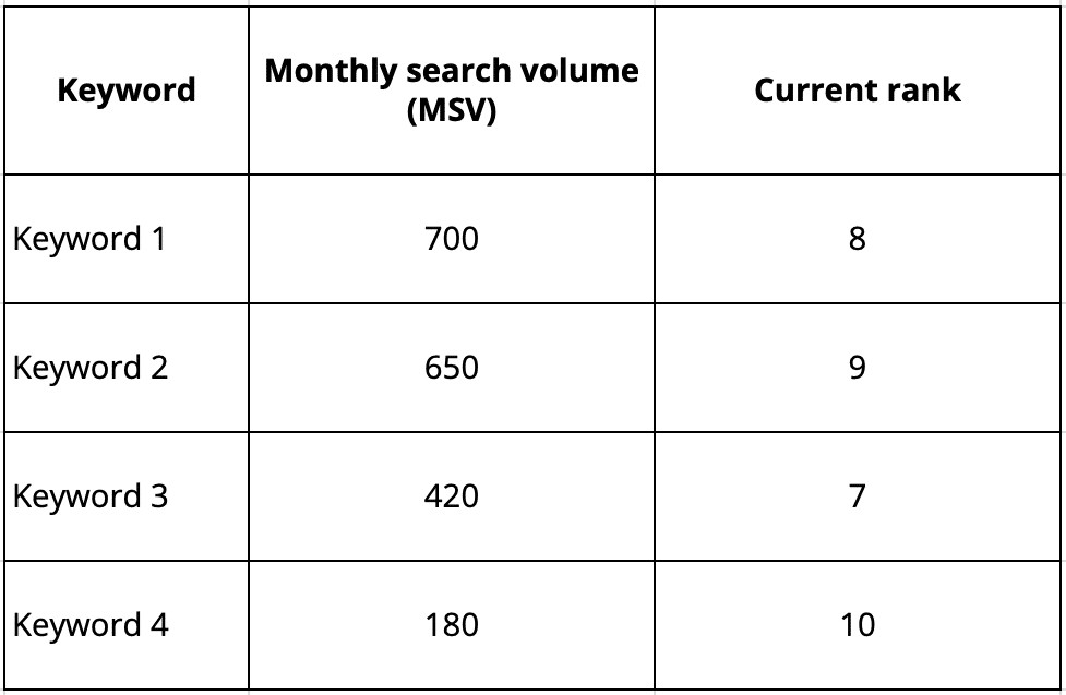 Set realistic ranking improvements, as shown below, and multiply the search volume by the corresponding new CTR.