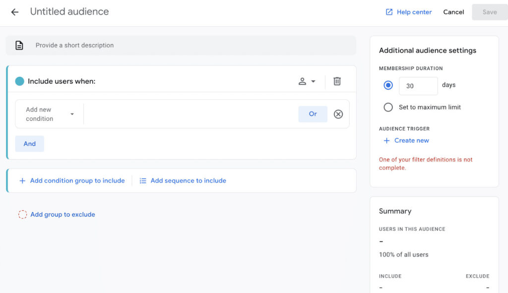 The audience builder is one of GA4’s most powerful assets. It lets you segment users in numerous ways – from specific conditions to time limits and value thresholds.