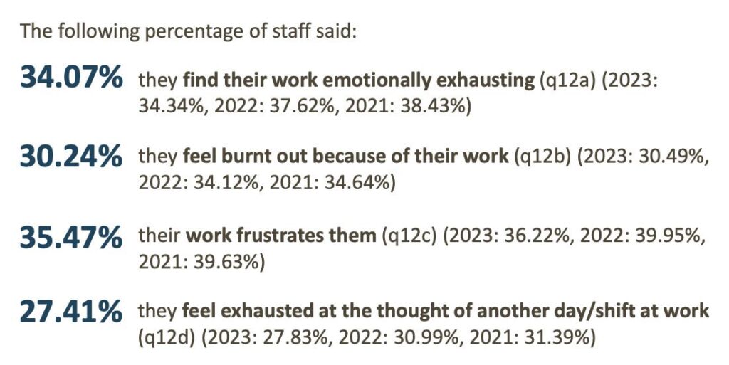 NHS staff survey 2024 shows 34% feel emotionally exhausted, 30% burnt out, 35% frustrated, 27% exhausted at work. (Source: NHS)