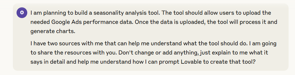 - Be specific and provide context: Tell the AI your data structure (e.g., “I have a CSV with columns: Date, Clicks, Cost”) and your business context (“We’re B2B SaaS with Q4 budget cycles”).