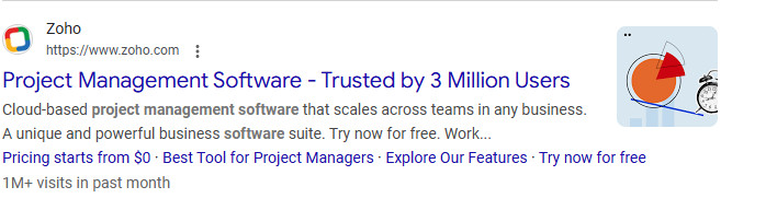 If you want to test multiple headlines with slightly different wording, pin them to the same position so the ad platform can rotate between them, but not show both at the same time. Zoho appears to be doing this by using both “Preferred by 3 Million Users” and “Trusted by 3 Million Users” as options.