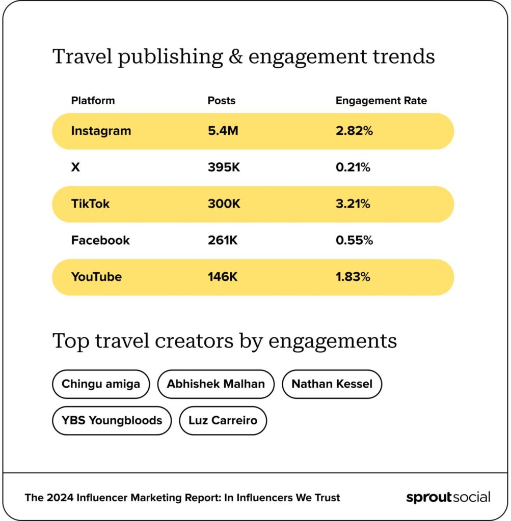 Sprout found TikTok has the highest engagement rate of 3.21% for the travel industry.