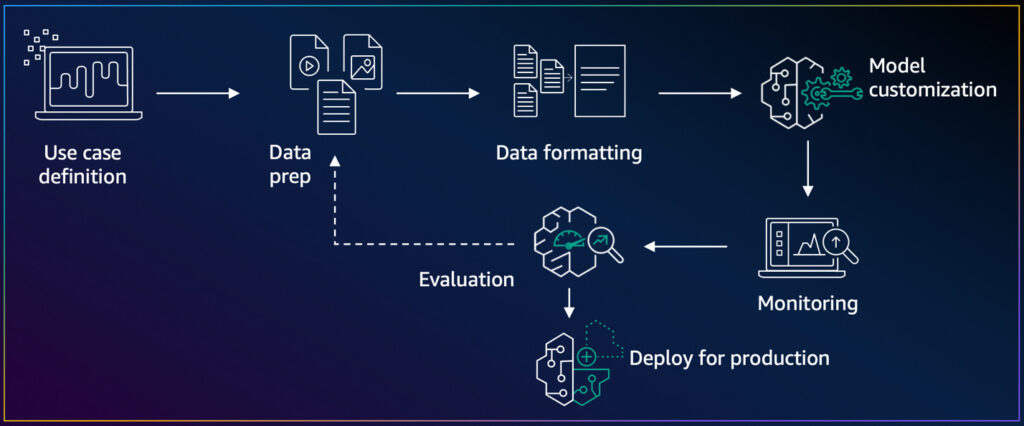 The model customization lifecycle represents the end-to-end journey from conceptualization to deployment. This process begins with defining your specific use case, preparing and formatting appropriate data, and then performing model customization through features such as Amazon Bedrock fine-tuning or Amazon Bedrock Model Distillation. Each stage builds upon the previous one, creating a pathway toward deploying production-ready generative AI capabilities that you tailor to your requirements. The following diagram illustrates this workflow.