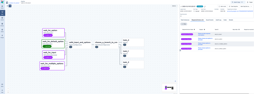 As AI agents and automated pipelines become more complex, the need for human oversight increases. Airflow 3.1 introduces powerful Human-in-the-Loop (HITL) functionality that allows workflows to pause execution in a deferred state and wait for a person to make a decision via the Airflow UI or API call.