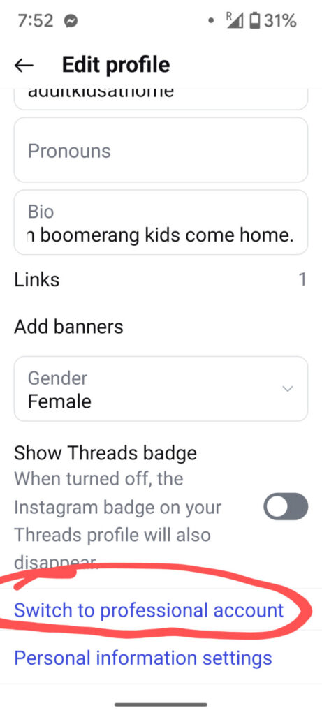 Just tap Edit Profile, then Switch to professional account. Want more details? Here’s our step-by-step guide to switching your personal account over (and 8 reasons why you should!).