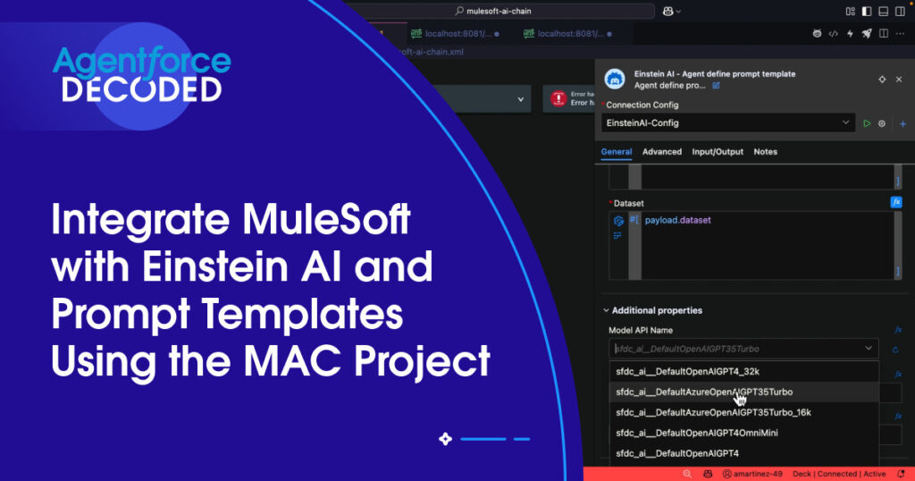In this blog post, we’ll explore how to connect a MuleSoft application with Salesforce’s Einstein AI using the MAC project. This integration enables your MuleSoft application to leverage the power of large language models (LLMs) such as OpenAI, Azure OpenAI, and others via the Einstein Trust Layer.