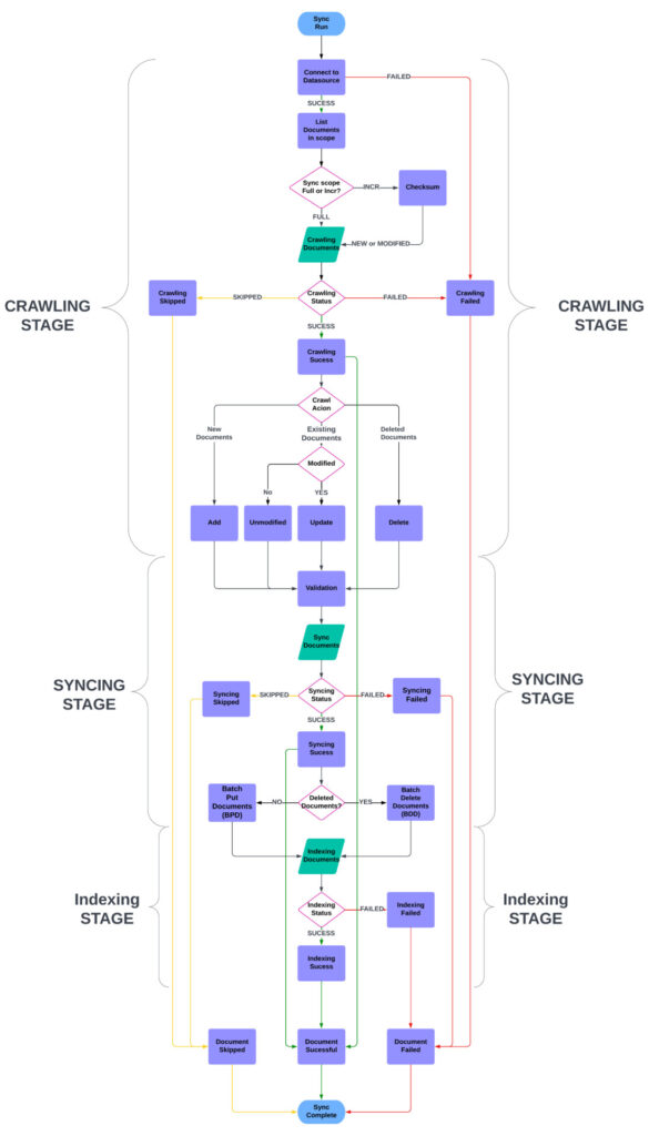 If the document is unmodified, it’s marked as UNMODIFIED and skipped in the rest of the stages. If any document fails in the crawling stage, for example due to throttling errors, broken content, or if the document size is too big, that document is marked in the sync run history report with the CrawlStatus as FAILED. If the document was skipped due to any validation errors, its CrawlStatus is marked as SKIPPED. These documents are not sent to the next stage. All successful documents are marked as SUCCESS and are sent forward.
