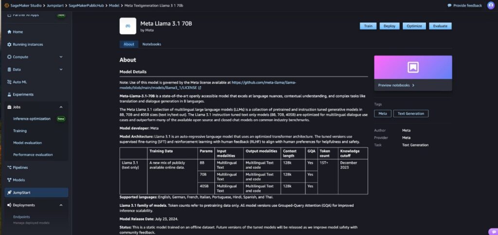 To learn more about the ModelBuilder class, refer to Package and deploy classical ML and LLMs easily with Amazon SageMaker, part 1: PySDK Improvements. In this example, you deploy the Meta Llama 3.1 70B model with the model name meta-textgeneration-llama-3-1-70b in Amazon SageMaker JumpStart.