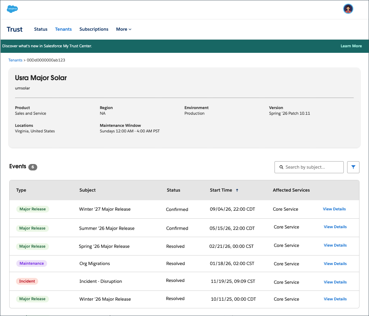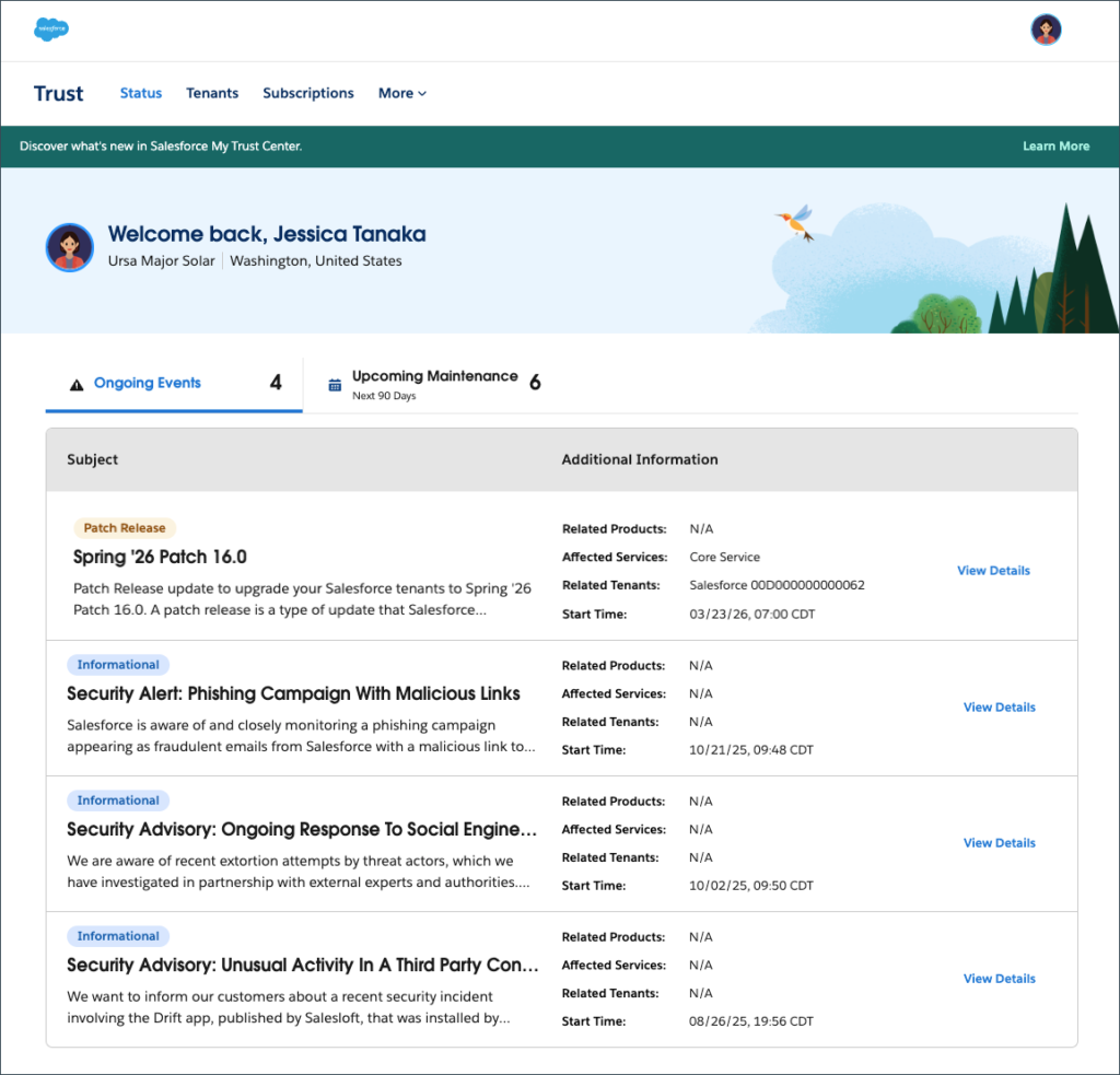 Today, we’re thrilled to introduce the ultimate quality-of-life upgrade for your release and maintenance planning: Salesforce My Trust Center. My Trust Center provides a personalized view of health and communications relevant only to a user’s specific instances and products, elevating the generic, global view of service health that the current public Salesforce Status site provides.