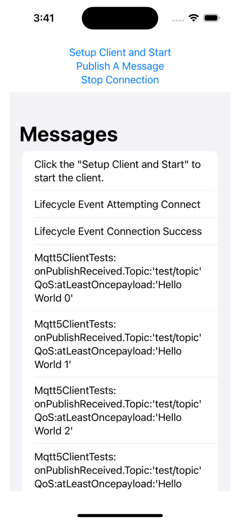 With support for iOS and tvOS, the SDK integrates seamlessly with Apple’s keychain for secure credential storage and retrieval. To help you get started, we provide a dedicated iOS PubSub sample that demonstrates MQTT 5 subscription and message publishing operations.