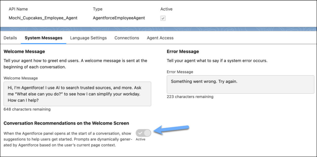 When it comes to AI, control and customization are key. You now have granular control over Employee Agent Conversation Recommendations. Previously, the helpful welcome and in-conversation suggestions for your Agentforce Employee Agents were always on. Now, you can tailor that experience for each agent. On the Agent Details page, you’ll find two new settings that let you independently turn the Conversation Recommendations on the Welcome Screen and the Conversation Recommendations in Agent Responses on or off. You can fine-tune the agent’s behavior, ensuring your employees see only the most relevant suggestions. For your existing agents, these settings default to ‘on’, so there’s no disruption. It’s all about giving you the controls to create the most effective experience for your team. Note: This applies to orgs with the Agentforce Employee Agent add-on.