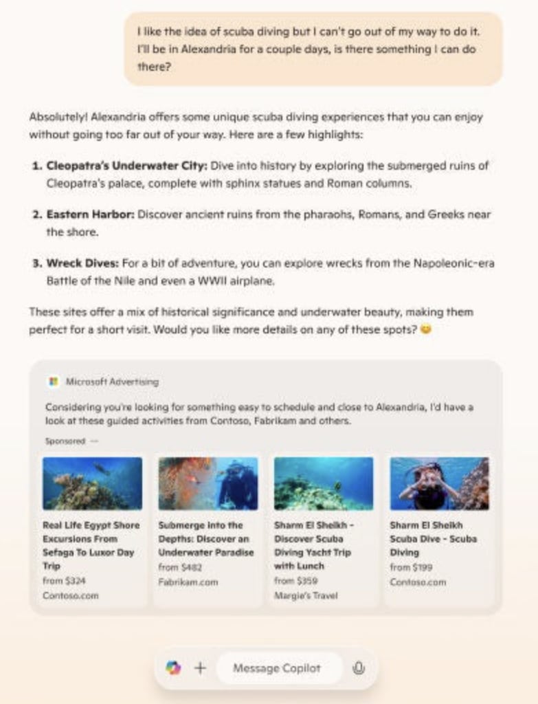 New Copilot ad experience. Copilot ads will appear below Copilot’s (organic) answers in a feature Microsoft is calling “ad voice.” This will include text referencing the conversation within Copilot and acts as a transitionary message from the advertiser. Fewer ad annotations and extensions will appear.