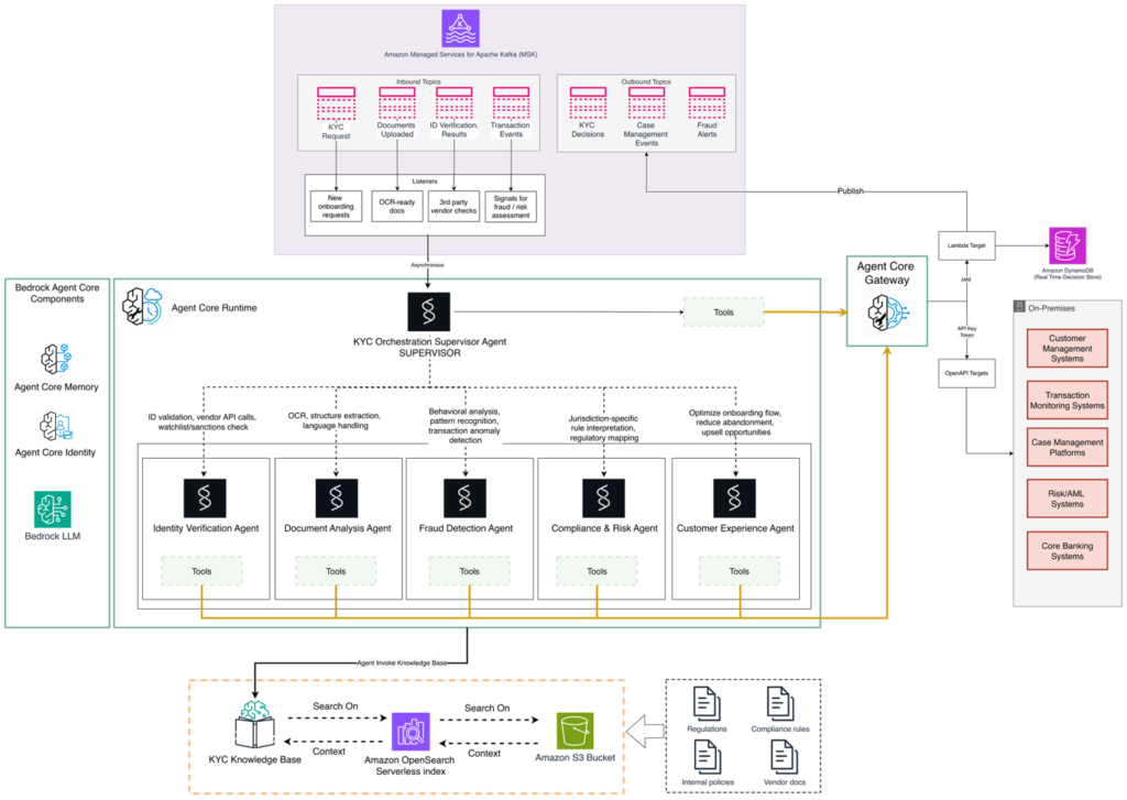 This architecture diagram illustrates an AI-driven Know Your Customer (KYC) Orchestration Framework built using Amazon Bedrock AgentCore and Amazon Managed Streaming for Apache Kafka (Amazon MSK). The design showcases how multiple specialized AI agents collaborate to automate and optimize KYC workflows, from document ingestion to compliance validation and fraud detection, while maintaining real-time integration with on-premises financial systems.