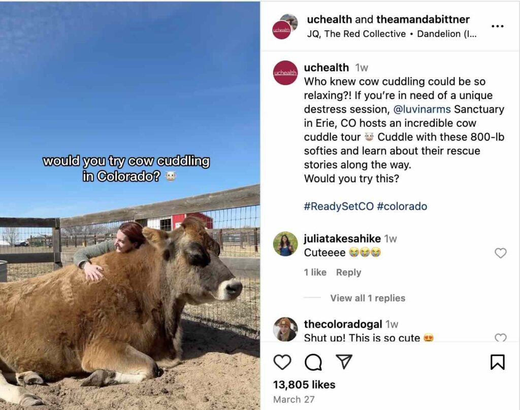 The hospital follows this same ethos on social, and develops original influencer content to help fulfill their mission. In their creator partnerships, they educate their audience about unexpected stress-relieving techniques like cuddling cows (yes, you read that right). They also use creator content to highlight the best hikes in Colorado and promote community health events.