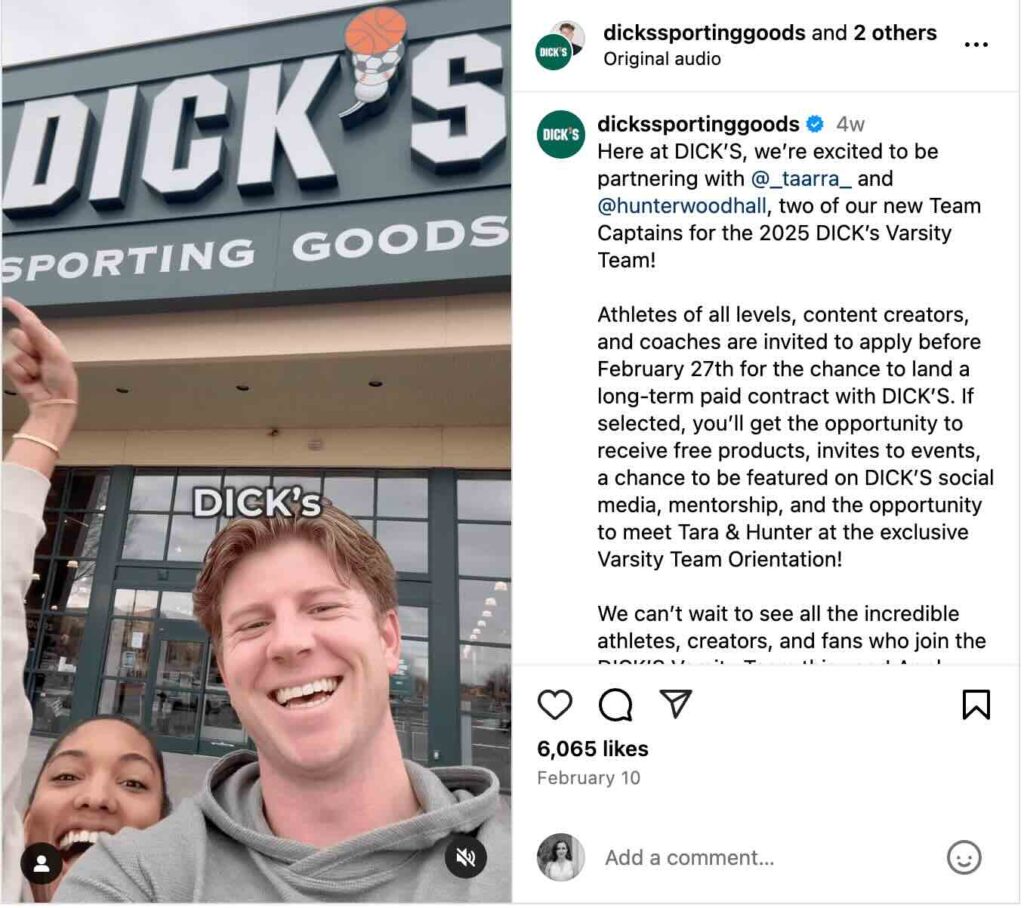 The brand is always finding new ways to enrich the in-store experience, like when they expanded Dick’s Varsity Team. The team is composed of young influencers who craft social content that the brand shares on its channels. But the partnerships go further than standard content, as Dick’s also features Varsity Team members in brand photoshoots, videos and in-store signage.