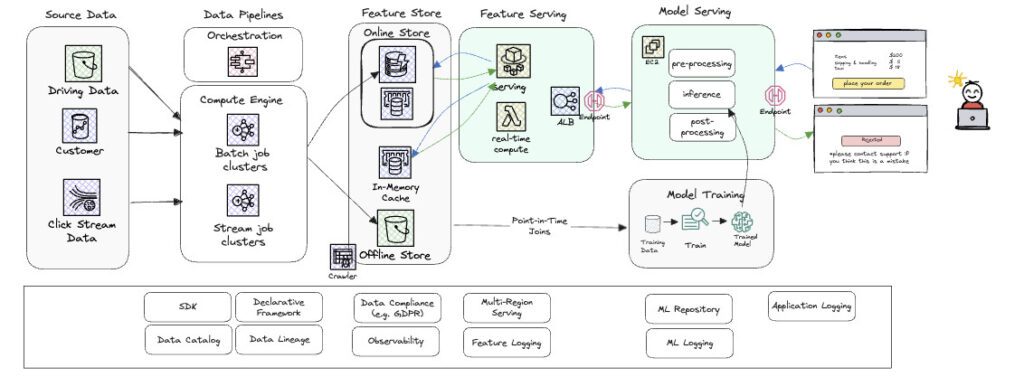 It pulls important historical data about the user and their behavior (for example, “How often does this person usually spend this much?” or “Have they made purchases from this location before?”), requesting the ML features from Tecton