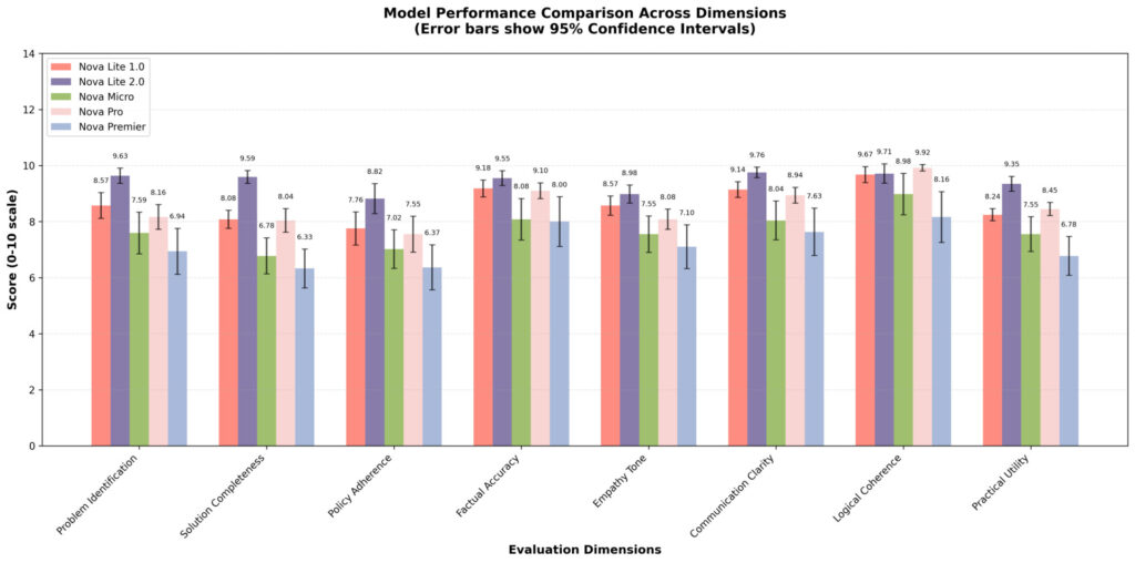- Multi-dimensional reasoning matters: Models scoring well on accuracy but poorly on empathy or clarity are unsuitable for customer-facing applications. The balanced performance of Nova Lite 2 across all dimensions makes it production-ready.
