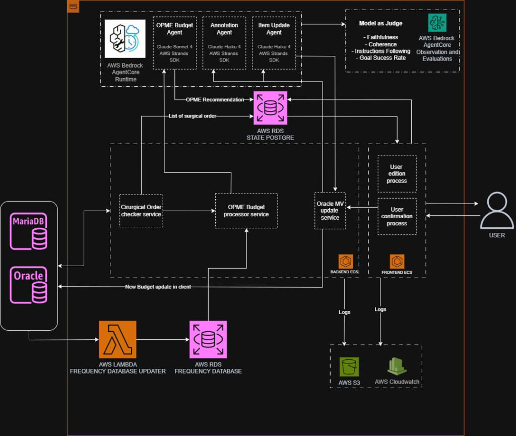 To govern AI agents, Rede Mater Dei partnered with A3Data and the AWS GenAI Innovation Center. Together, they built the entire critical execution and governance layer for agents on Amazon Bedrock AgentCore, which became the operational heart of the suite. This project is a pioneering initiative in Latin America. It tests AgentCore Evaluations in a comprehensive, large-scale AI solution for a high-impact healthcare business application.