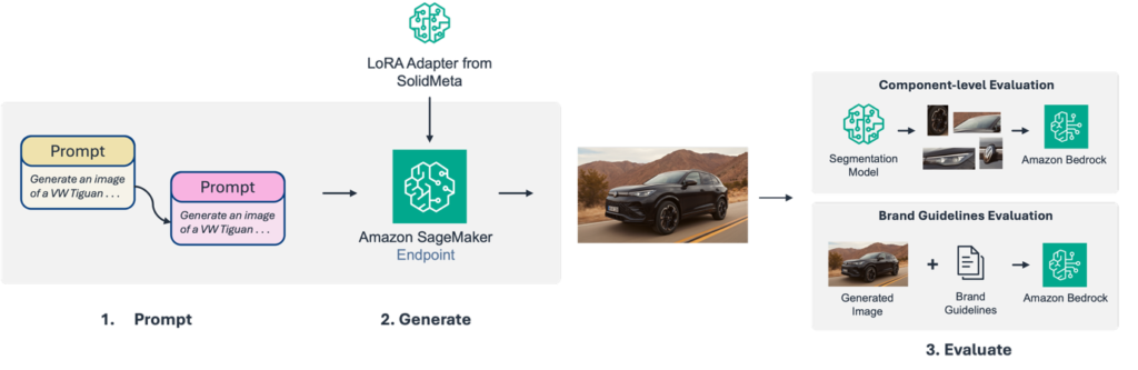 Volkswagen Group stands as one of the world’s largest automotive manufacturers, delivering 6.6 million vehicles in the first nine months of 2025. The Group comprises ten distinct brands from five European countries: Volkswagen, Volkswagen Commercial Vehicles, ŠKODA, SEAT, CUPRA, Audi, Lamborghini, Bentley, Porsche, and Ducati. In 2025, the AWS Generative AI Innovation Center worked with Volkswagen Group’s marketing and technical teams to build a solution that could harness generative AI’s speed and scale while maintaining the brand precision that defines Volkswagen Group. The result is an end-to-end marketing image generation and evaluation pipeline, with image generation models hosted on Amazon SageMaker AI endpoints and image evaluation powered by Amazon Bedrock. The following diagram shows the end-to-end marketing image generation and evaluation pipeline.