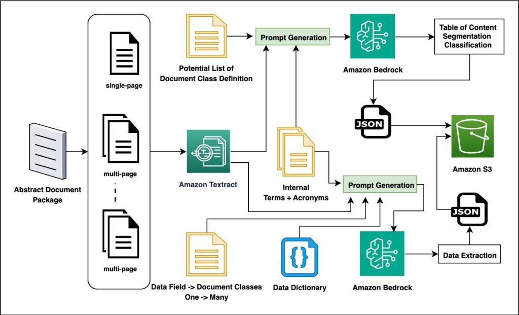 - Advanced prompt engineering – The team developed specialized prompts that strategically guide the behavior of the large language model (LLM) for different document processing tasks. Document analysis prompts combine content with classification guidelines to facilitate accurate document segmentation, and information extraction prompts incorporate field definitions and domain knowledge to target specific data elements within documents. These carefully crafted prompts include illustrative examples and precise formatting instructions that enable the model to produce consistent, structured outputs across various document types and formats.