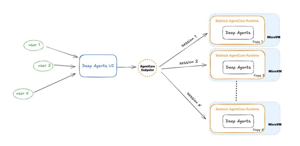 In this post, we demonstrate how to deploy Deep Agents on AgentCore Runtime. As shown in the following figure, AgentCore Runtime scales any agent and provides session isolation by allocating a new microVM for each new session.