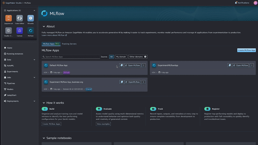 A default MLflow App is automatically provisioned when you create a SageMaker Studio domain, streamlining the setup process. It’s enterprise-ready out of the box, requiring no additional provisioning or configuration. The MLflow App scales elastically with your usage, alleviating the need for manual capacity planning. Your training, tracking, and experimentation workloads can get the resources they need automatically, simplifying operations while maintaining performance.