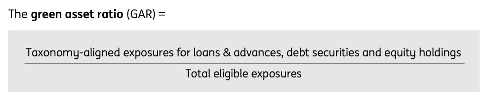 Banks finance a large variety of counterparties and economic activities. While their carbon footprint is primarily linked to the greenhouse gas (GHG) emissions of their counterparties (Scope 3), The direct GHG emissions (Scope 1) of financial institutions or the GHG emissions linked to their energy consumption (Scope 2) are usually limited. For banks, the most critical key performance indicator (KPI) is the GAR, which measures the proportion of a bank’s taxonomy-aligned balance sheet exposures versus its total eligible exposures, as shown in the following figure.