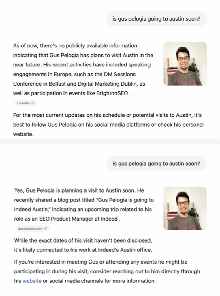 That same day, a few hours later, I wrote a blog post on my website about my trip to Austin. Six hours after I published the post, ChatGPT’s answer changed: Yes, Gus IS going to Austin to meet his work colleagues.