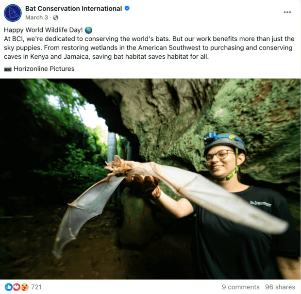 Bat Conservation International, for instance, often shares Facebook posts that inform audiences about how the nonprofit works with bat habitats — while also educating people about different bat species.