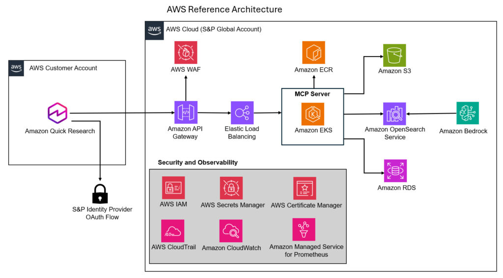 S&P Global’s MCP server architecture is shown in the following diagram. When using one of the S&P integrations, traffic flows from Quick Research through an Amazon API Gateway to an AWS Application Load Balancer with the MCP services hosted on Amazon Elastic Kubernetes Service (Amazon EKS). The MCP server uses data hosted in Amazon S3 and AWS Relational Database Service for PostgreSQL for structured data, and Amazon OpenSearch Service for vector storage. This architecture delivers enterprise-ready MCP servers with defense-in-depth security, automated scaling, and comprehensive observability.