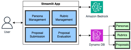 The team used DynamoDB, a NoSQL database, to store the personas, rubrics, and submitted proposals. The data stored in DynamoDB was sent to Streamlit, a web application interface. On Streamlit, the team added the persona and rubric to the prompt and sent the prompt to Amazon Bedrock.