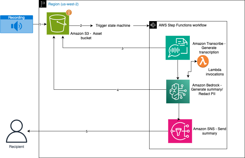 An audio recording is provided as an input to the Step Functions workflow. This could be done manually or automatically depending on the specific use case and integration requirements.