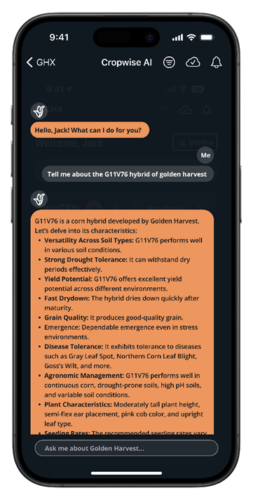 Cropwise AI enhances the seed selection process by acting as a valuable companion to the expertise of sales representatives and the decision-making process of farmers. For sales representatives, it empowers them with deeper insights, enabling more informed recommendations. For farmers, it offers an accessible resource for exploring and comparing seed options. The following example shows the Cropwise AI mobile app in GHX 2.0 describing a common seed product (left) and the transcribed conversation (right).