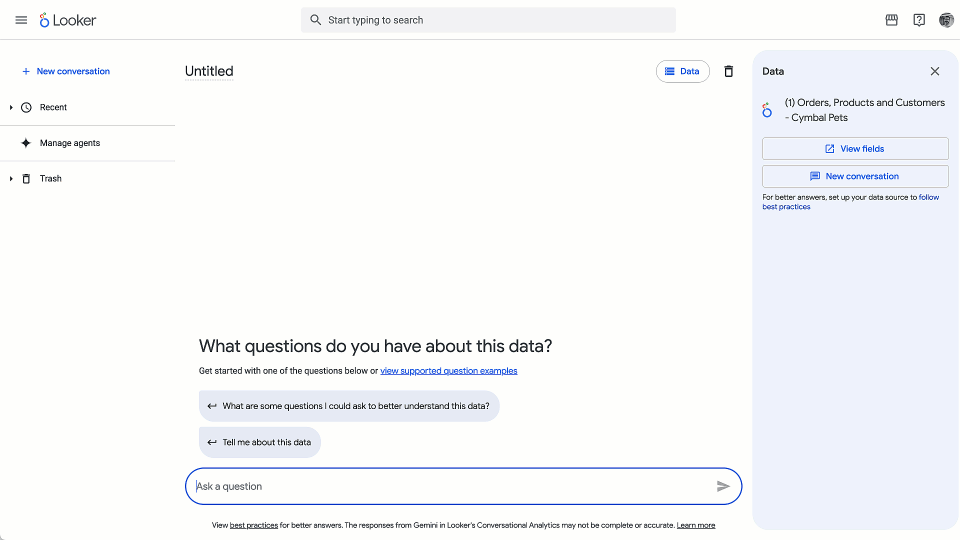 The general availability of Conversational Analytics combines the reasoning power of Gemini, new capabilities in Google’s agentic frameworks, and the trusted data modeling of the Looker platform. Together, these set the stage for the next chapter in self-service analytics, making reliable data insights accessible to the entire enterprise. Conversational Analytics agents can understand your questions and provide insightful answers to questions about your data.