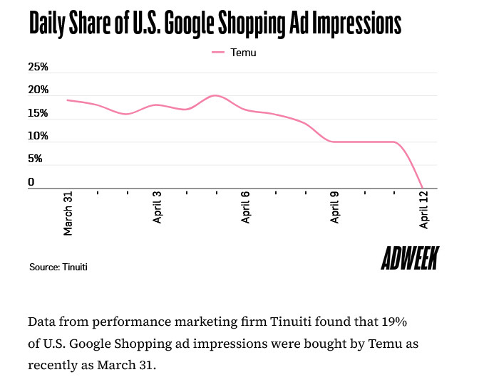 - Over three days in April, Temu’s Google Shopping impression share collapsed, signaling a total pullback.