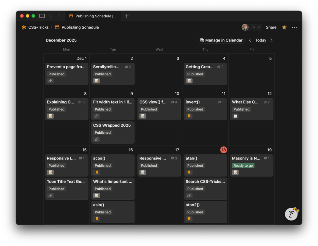 ✅ Fill in the Almanac. No need to rehash all the work. Last year at this time, I said, “We’ve only got a few pages in the at-rules and functions sections that we recently created and could use all the help we can get.” I never imagined we’d end the year with 104 new pages, including all of the at-rules. I can’t thank the likes of Juan Diego, Danny, Sunkanmi Fafowora, John Rhea, and Gabriel Shoyombo enough for going above and beyond to make this one happen. Again, I’m incredibly proud of this treasure trove of CSS documentation and believe it’s a core part of what CSS-Tricks is.