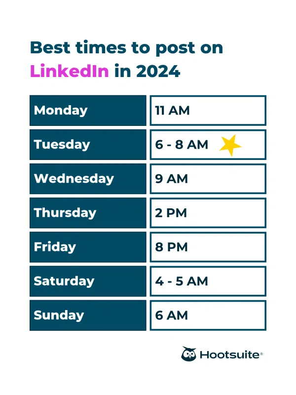 Planning on posting more than once or twice a week? Below is a breakdown of the best times to post on LinkedIn throughout the week, based on what the Hootsuite social team found: