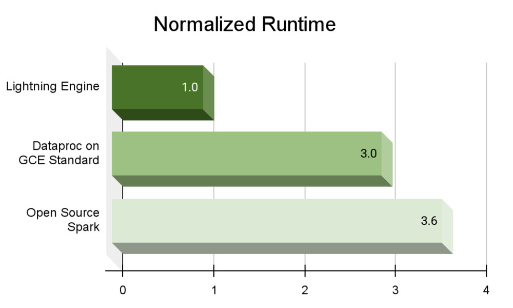 - High performance: Currently in preview, the Lightning Engine Spark engine provides 3.6x better performance compared to open-source Apache Spark, thanks for traditional optimization techniques like query and execution optimizations, as well as optimizations in the file-system layer and connectors. It is fully compatible with open-source Apache Spark, and can plug into existing workloads running Dataproc on Google Compute Engine.