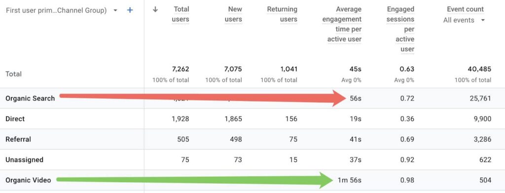 As you can see, the average visit from YouTube lasts almost twice as long as a visit from organic search.
