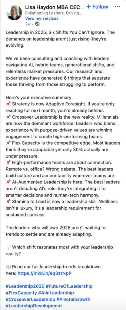 For example, if you’re sharing a tip for adapting to recent leadership trends, like in the example below, try using descriptive hashtags like #Leadership2025 and #FutureOfLeadership.