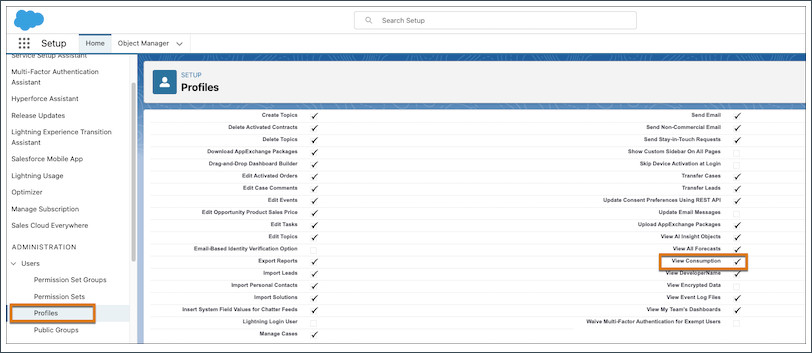Method 1: Add the View Consumption permission to the user’s User Profile in the Setup menu.