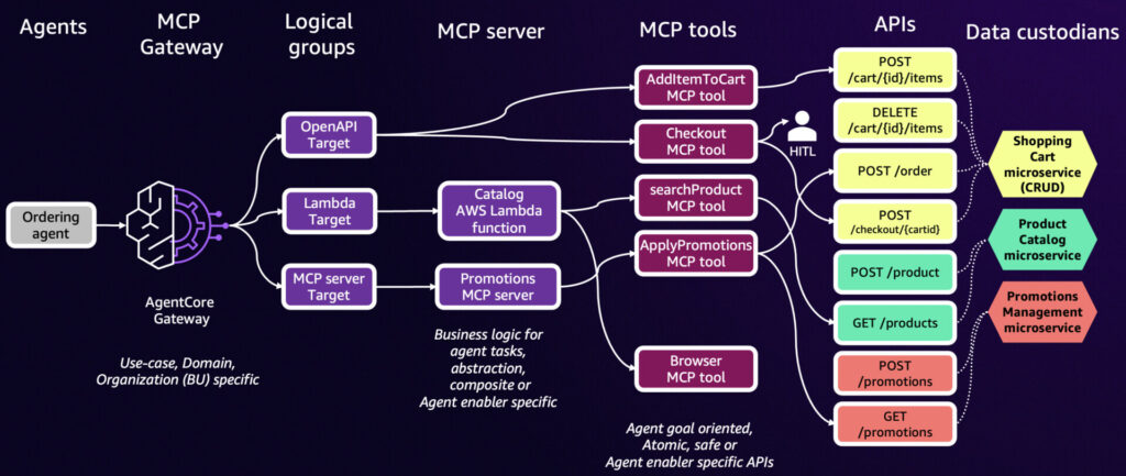 Previously, an ordering agent would need to interact with each of these MCP servers separately, managing multiple connections and authentication contexts. With the new MCP server target support in AgentCore Gateway, these specialized servers can now be unified under a single gateway while maintaining their team-specific ownership and access controls. The power of this approach lies in its organizational flexibility. Teams can group their MCP servers based on multiple logical criteria: